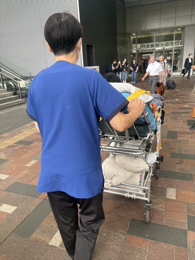 新幹線多目的室に移動後、苦痛のない体勢に整え、窓の景色を見て、これで神戸に行けるんですねと、表情もほころび、付き添いのお父さまも、安心されたようでした。